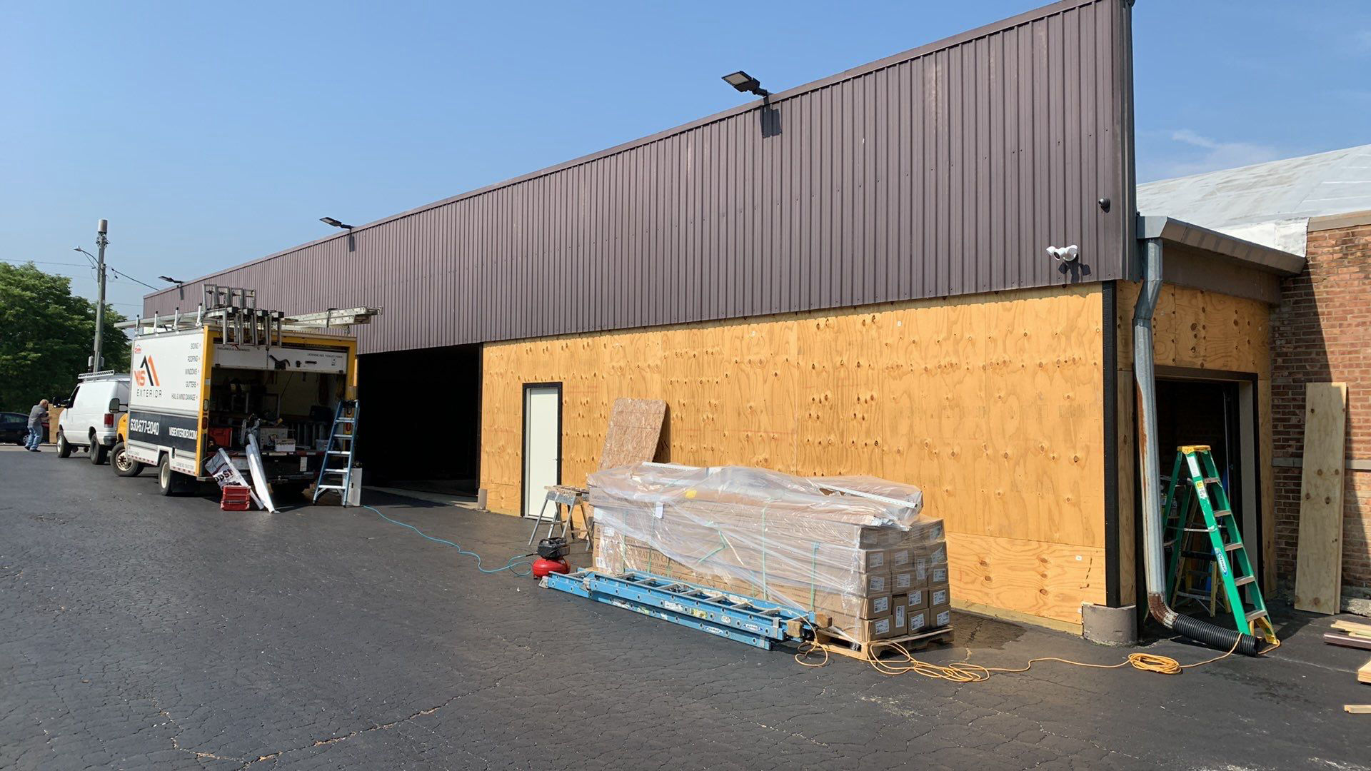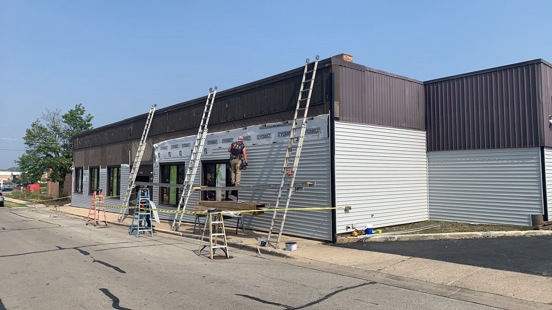While the existing black/charcoal vertical siding on the upper half of the parts of the building remained, we chose CertainTeed Restoration Classic D4.5 smooth vinyl horizontal siding in sterling gray for the lower half of the building. This provided a distinct definition that not only broke up the monotony of having only one type of siding over a majority of the building, but also offered a nice aesthetic appropriate for a commercial building of this architecture.