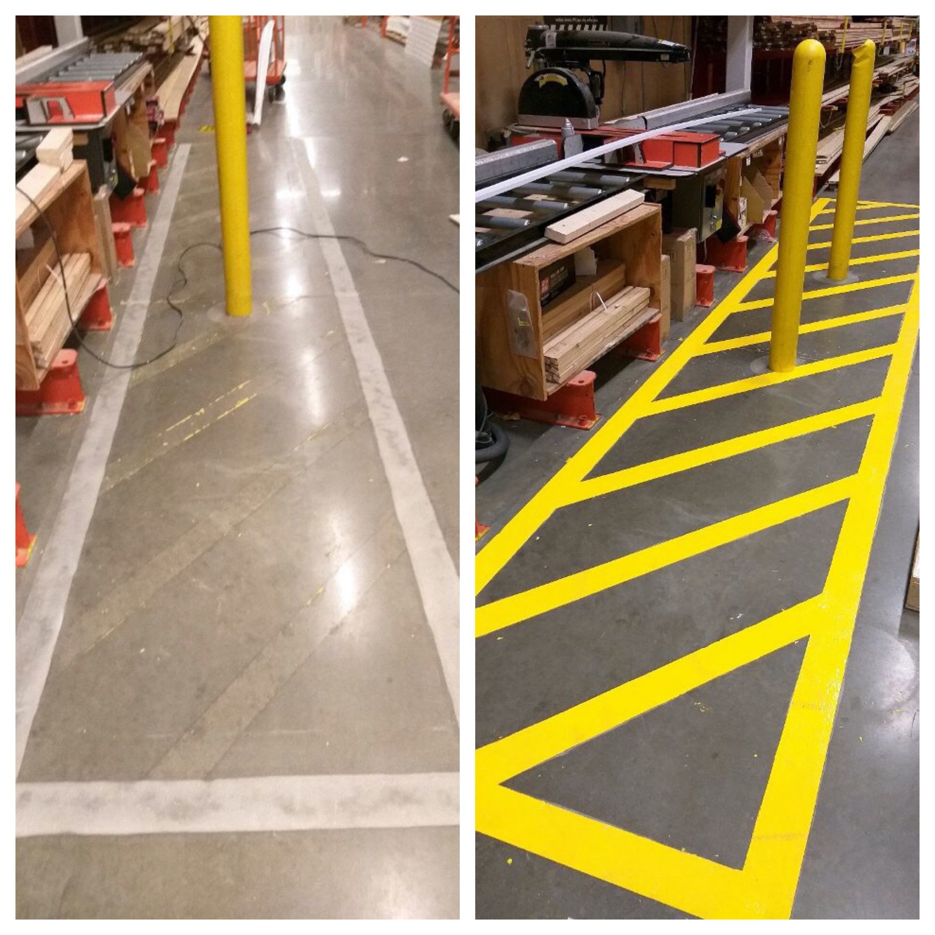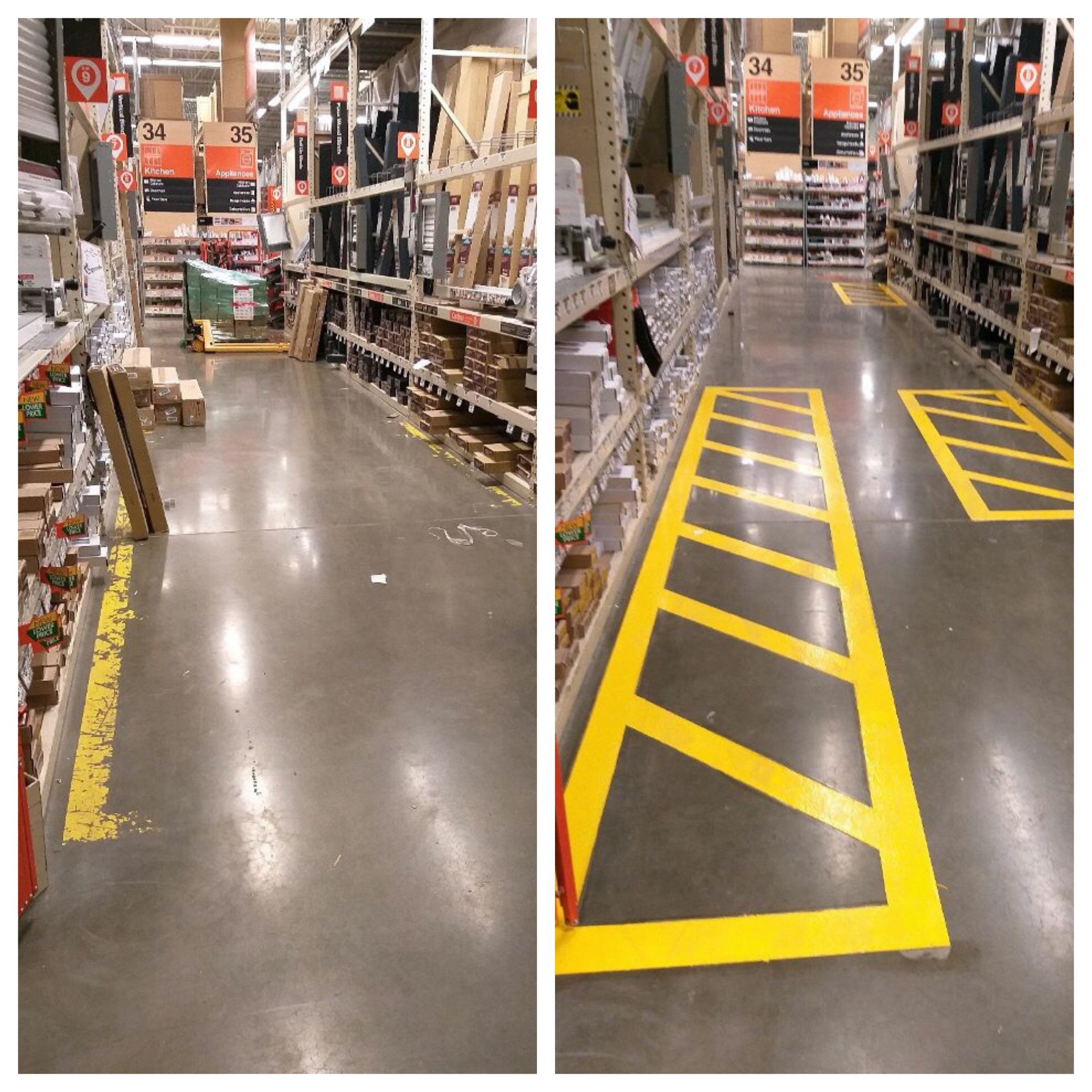 Floor marking projects require following very specific guidelines, as the safety lines are pertinent in keeping Home Depot employees and customers safe throughout the store. Painters Inc. employees arrived after store hours, removed old lines and replaced them with new ones throughout the store in a very short time span, only three nights.