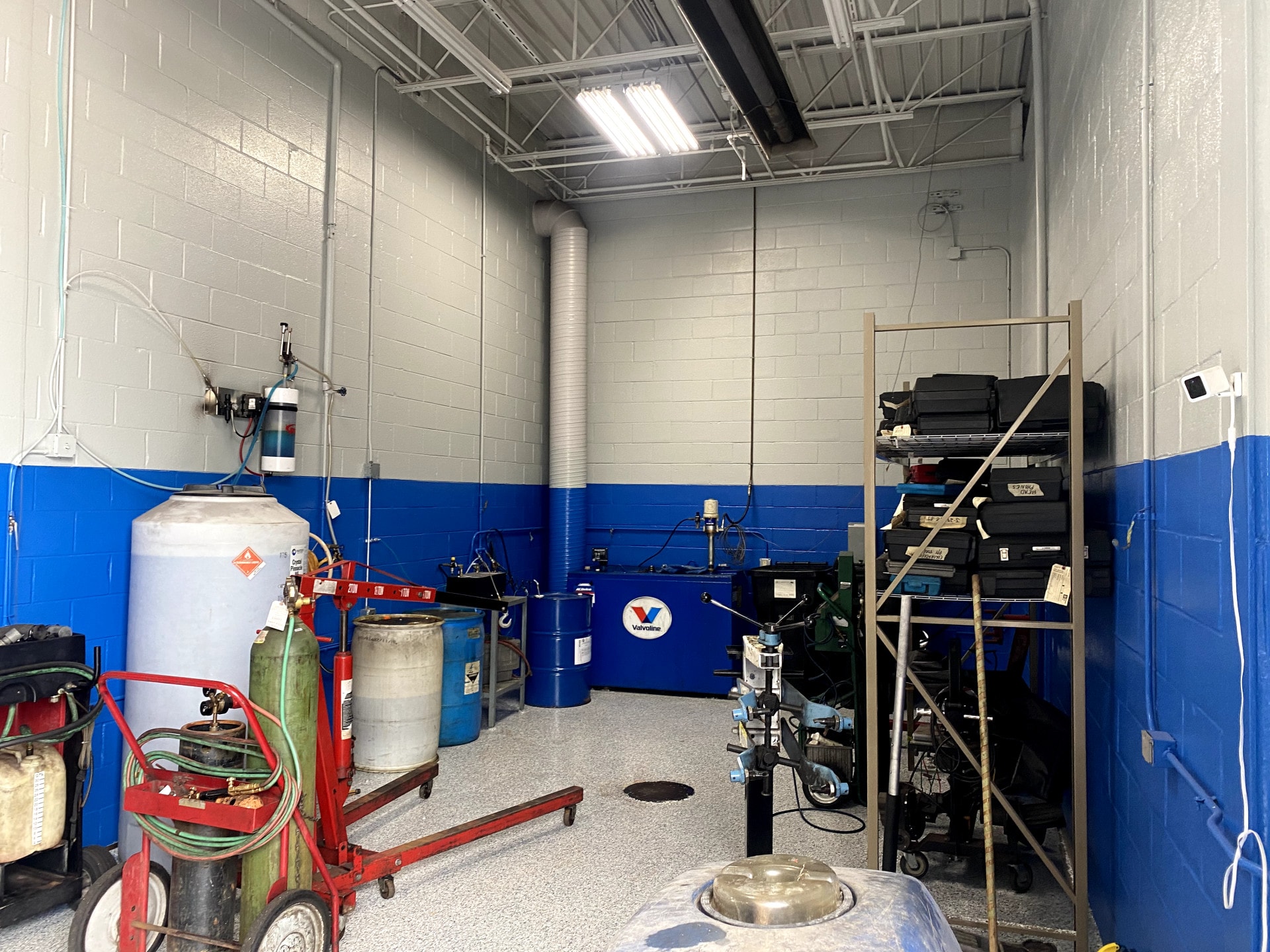 Obviously, repair shops are going to be high-traffic areas where there is plenty of oil, grease and other substances that will accumulate on surfaces. We began with a thorough cleaning of all the surfaces that were to be painted. Once clean and dry, we used Sherwin-Williams Pre-Catalyzed epoxy paint and Benjamin Moore Scuff-Ex, both of which are made to hold up to dirty environments like auto shops. Furthermore, these paints hold up to frequent cleaning.