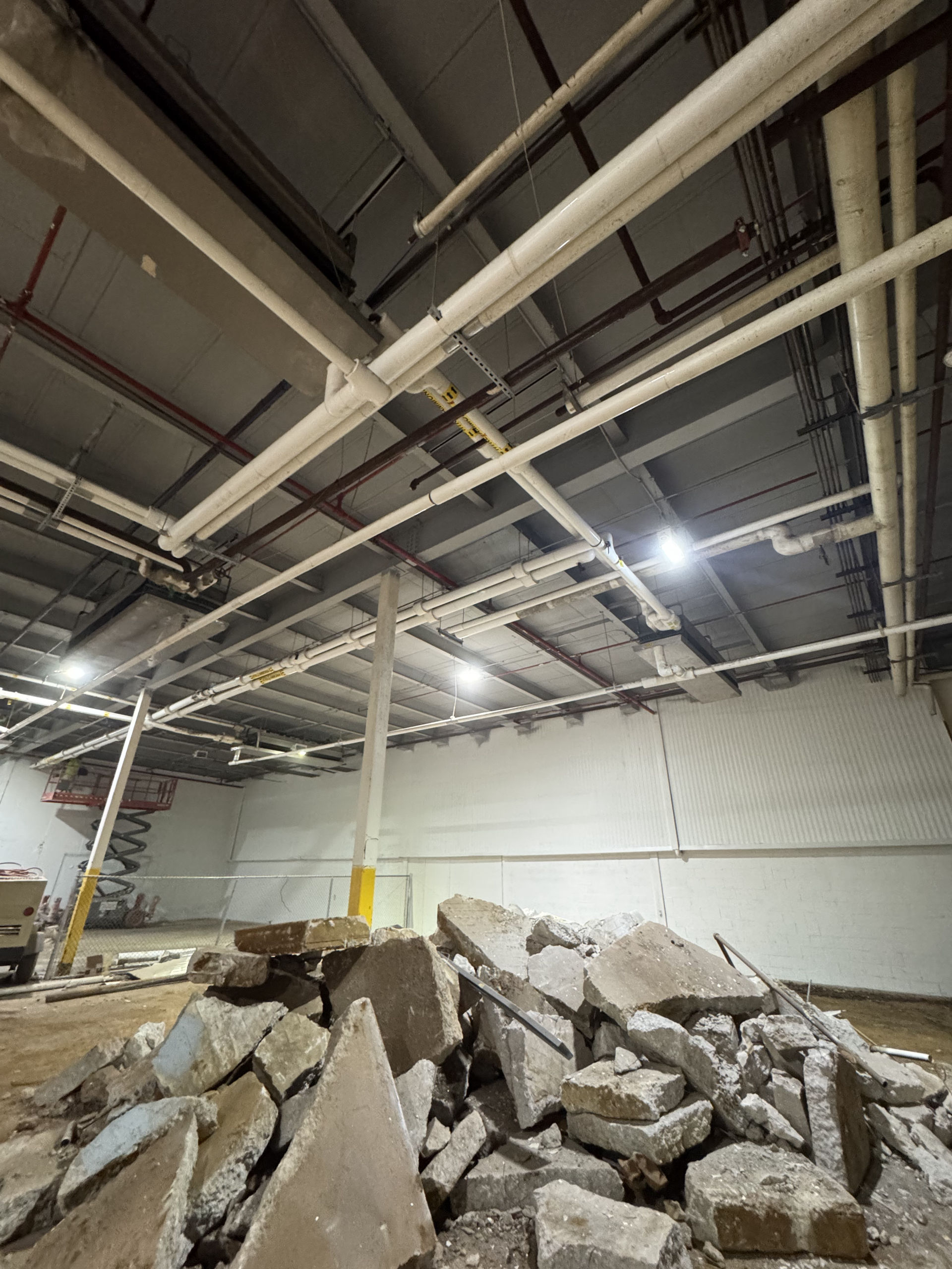 On the ceilings, we applied Sherwin-Williams ProBlock primer, Kem Bond primer, and Alkyd Dryfall. For the walls, we chose Sherwin-Williams Pro Industrial Multi-Surface. For the intricate pipework, we applied Sherwin-Williams Industrial paint.