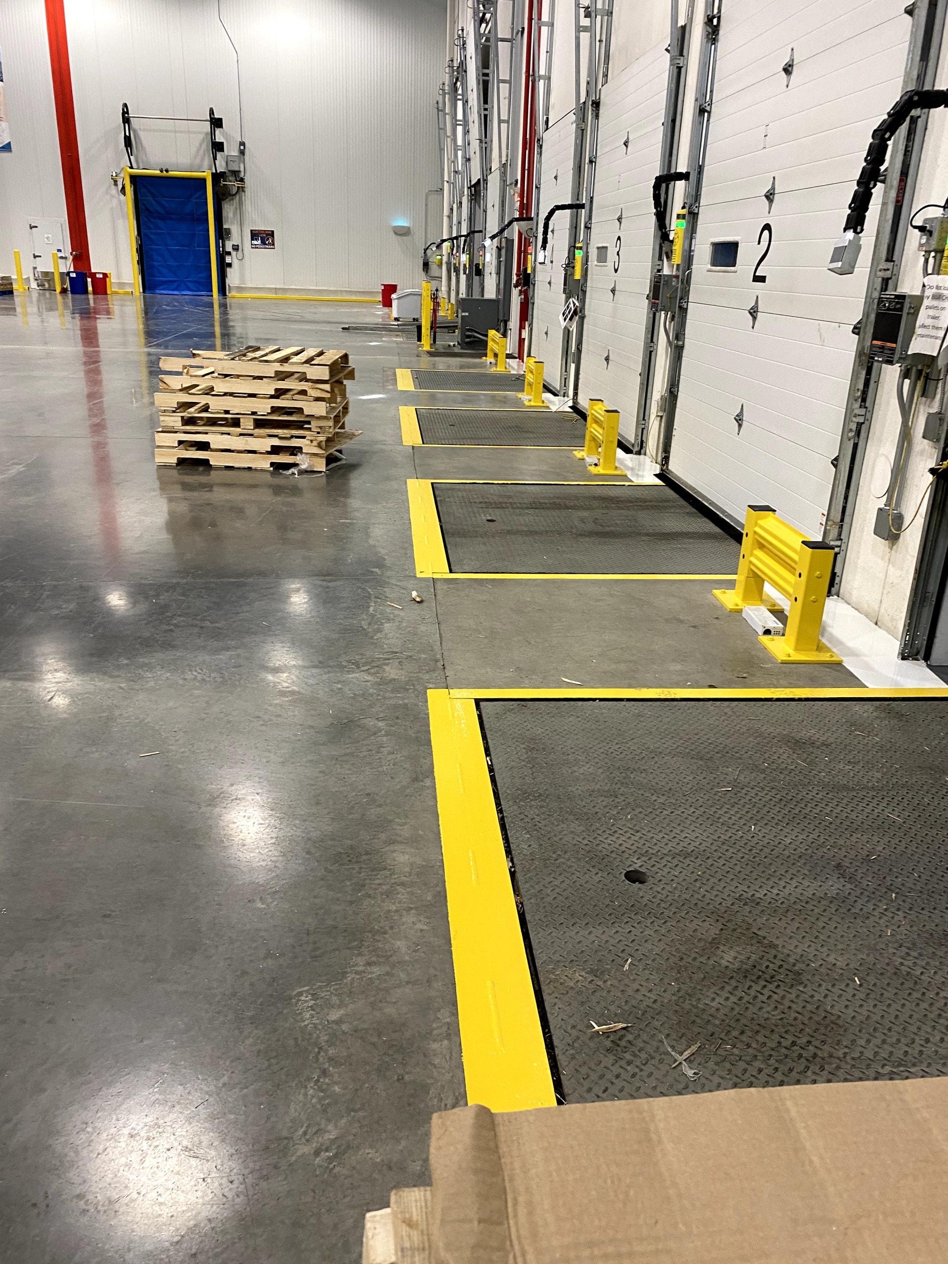 Commercial food warehouses are often bustling spaces where products are constantly being moved by wheeled vehicles, but there is also plenty of foot traffic. These spaces require detailed safety lines that help the flow of traffic, keeping everyone safe while production is unhampered. Painters Inc. took on a week-long, 600,000-square-foot commercial warehouse project in Romeoville where we painted interior safety railing, bollards, dock levelers, yellow safety lines and white safety lines.