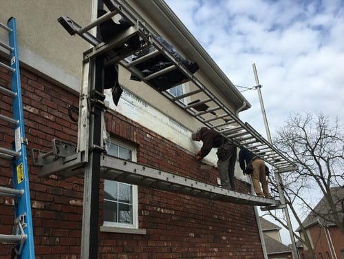 They started by removing the Dryvit, which is a technical and time consuming task. Some areas of the home were very high up and there was a lot of debris flying around. After four days of hard work in inclimate weather, the Dryvit was completely removed and we were ready to install siding.