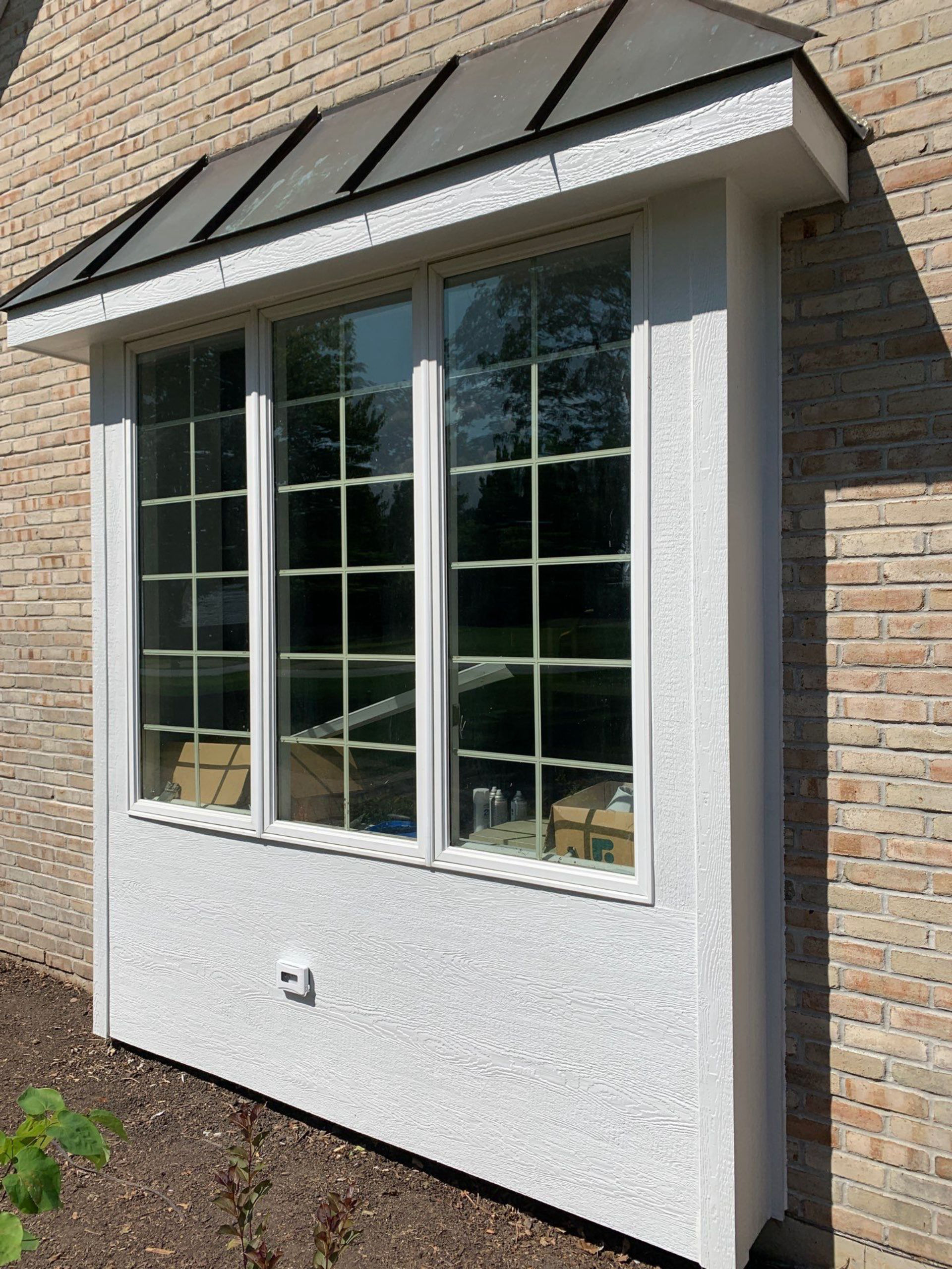 For this project, we chose LP SmartSide ExpertFinish white 5/4x4x4-in. wood grain corner posts on all applicable areas. We chose ExpertFinish 3/8x8x16-in. wood grain lap siding in the Desert Stone color. We also installed a white ExpertFinish soffit and 1×8-in. fascia board. For the gutters, we used seamless, 5-in. material and 3×4-in. Downspouts, also in white.