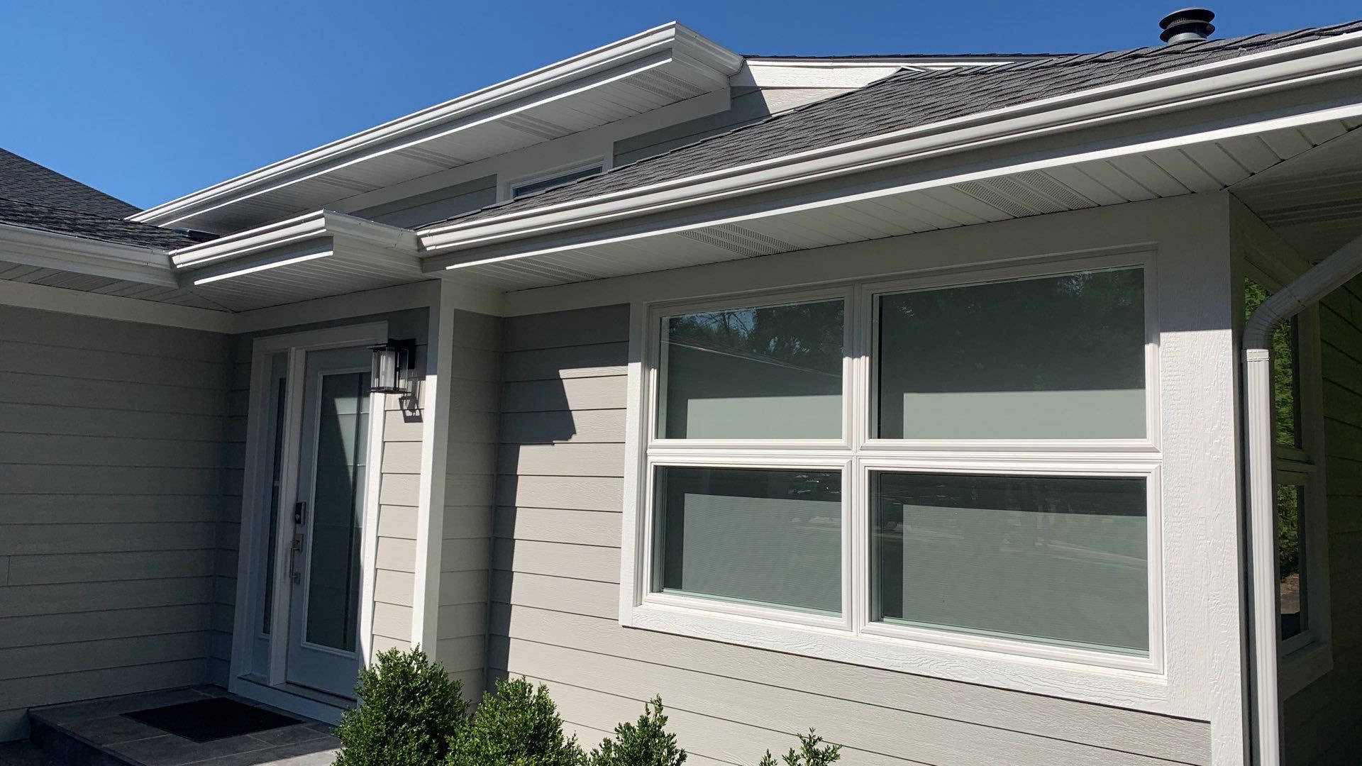 Following the completion of the roof phase, our crew moved on to the siding, which involved removing the old siding and replacing it with LP Smartside lap siding and LP trim around the windows, soffits and fascia. Aluminum gutters were installed with “Bulldog” bran guards. Finally, we also installed a new front door. The customer was pleased that one contractor could handle all the different aspects of the project.