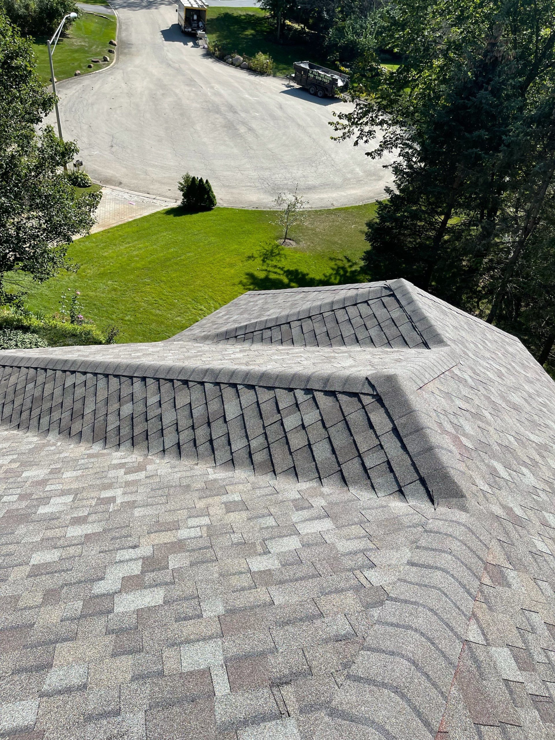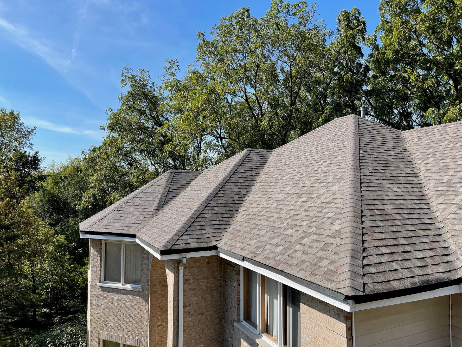 This roof offered some challenges, as it was large and was built with a more architecturally bolder design. Keeping with the modern and bold motif, we installed Owens Corning architectural shingles in the driftwood color, which really boosted the curb appeal of the home. We also installed white gutters with 3 in. by 4 in. downspouts.