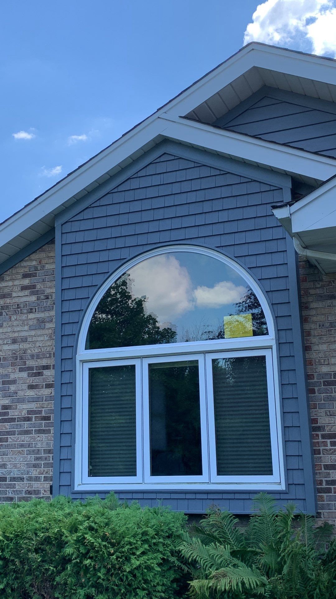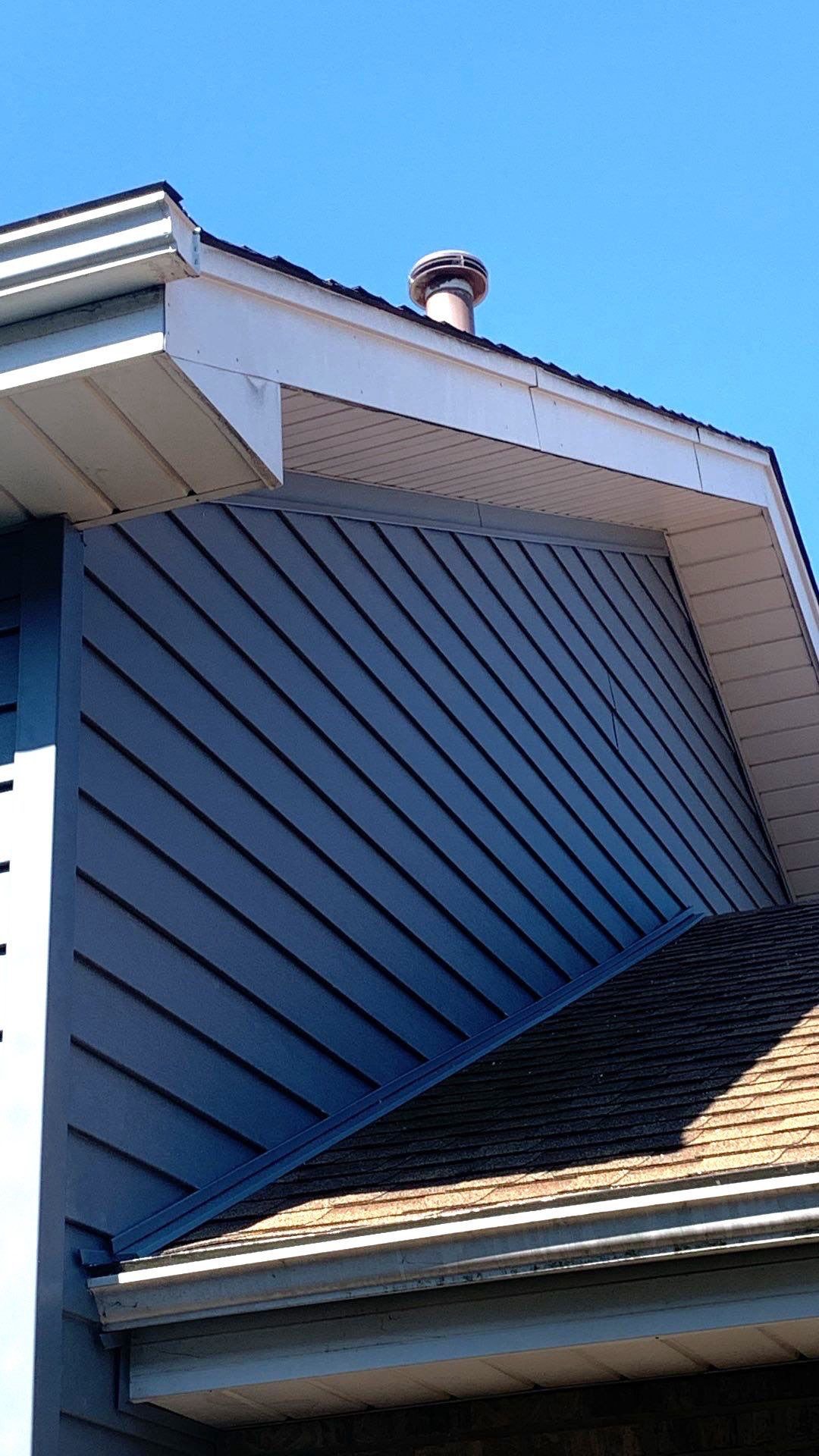 First, we wrapped the frieze board along the soffit in aluminum and installed wrap over the existing wood, which offers an extra layer of insulation that helps with energy costs. Our crew used the D6 siding for all the walls and put the Royal Shake material around the front window. The color of the siding was called “Storm,” which is the company’s nature-inspired palette that includes earth tones.